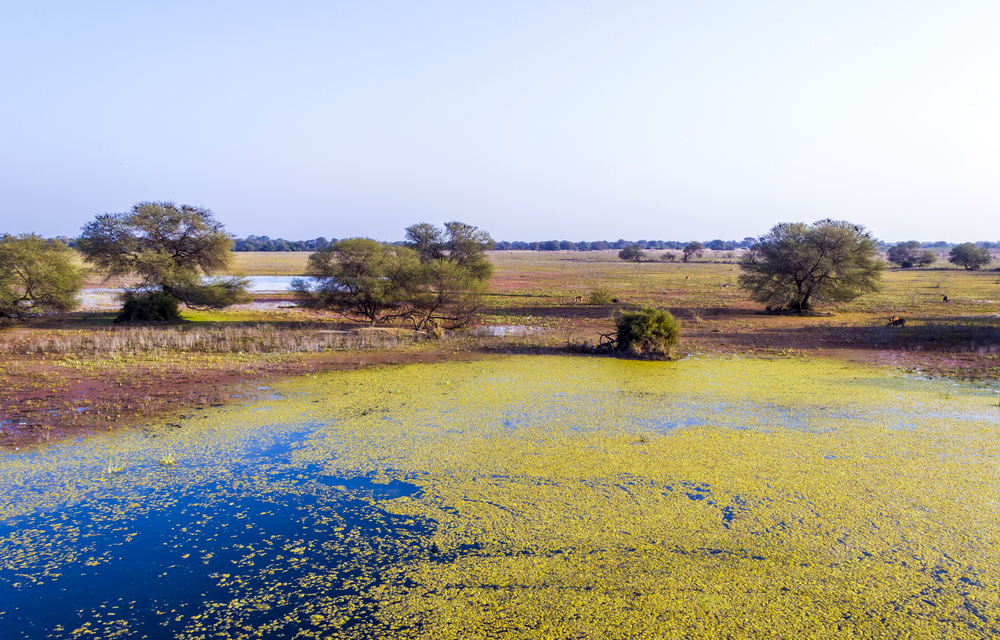Much of the flood area is characterized with semi-arid biotype. Only the area within the park has much vegetation, hence the fond name ‘Ghana’ which is translated to mean thicket. Principal vegetation here comprises of dry deciduous forests and dry grassland. The artificially managed marshes contain some areas covered with medium-sized trees and shrubs. The forests are dominated by jamun, babul, kalam with some scrublands dominated by ber and kair. The aquatic vegetation forms an integral part of the food system that helps the proliferation of waterfowls.